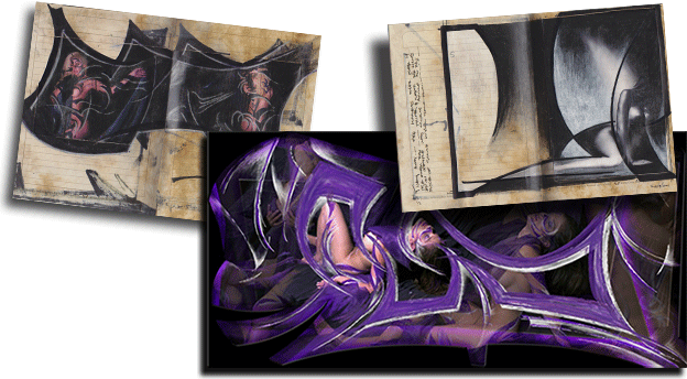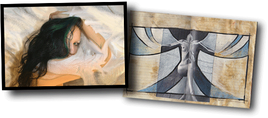 These paintings start with brushes on the bare human figure as the canvas. The photographs of the painted models are then retraced with digital brushes and digital paint. The digital painting is printed onto canvas only to be further enhanced. Each time the process crosses the line between digital and analog the lines are blurred between human and portrait, muse and inspiration.