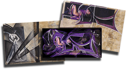 These paintings start with brushes on the bare human figure as the canvas. The photographs of the painted models are then retraced with digital brushes and digital paint. The digital painting is printed onto canvas only to be further enhanced. Each time the process crosses the line between digital and analog the lines are blurred between human and portrait, muse and inspiration.